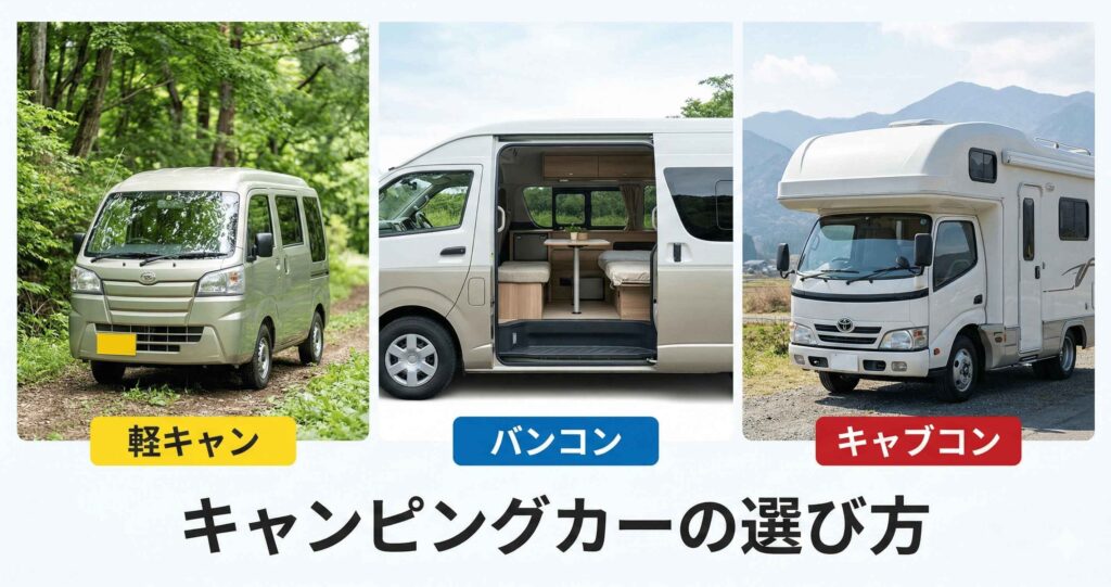 北海道でキャンピングカーを選ぶときは、車種名だけで決めると失敗しやすくなります。軽キャン・バンコン・キャブコンは、運転しやすさ、就寝人数、荷物の積み方が大きく異なるためです。このページでは、初めてでも判断しやすいように、車種ごとの違いを具体例つきで整理します。