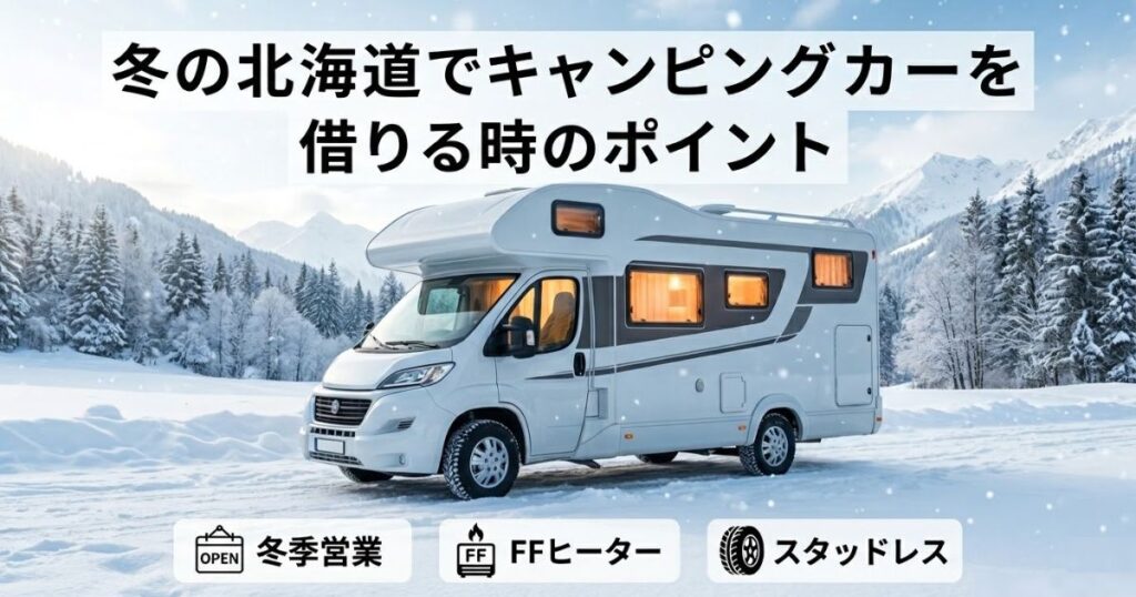 冬の北海道でキャンピングカーを借りるときは、料金より先に「冬季営業」「FFヒーター」「スタッドレス」をそろえて確認するのが基本です。ここが曖昧なまま予約すると、借りられると思っていた車両が冬は止まっていたり、暖房条件が想定と違ったりします。まずはこの3点を基準に候補を整理し、その後で個別条件を確認すると判断しやすくなります。